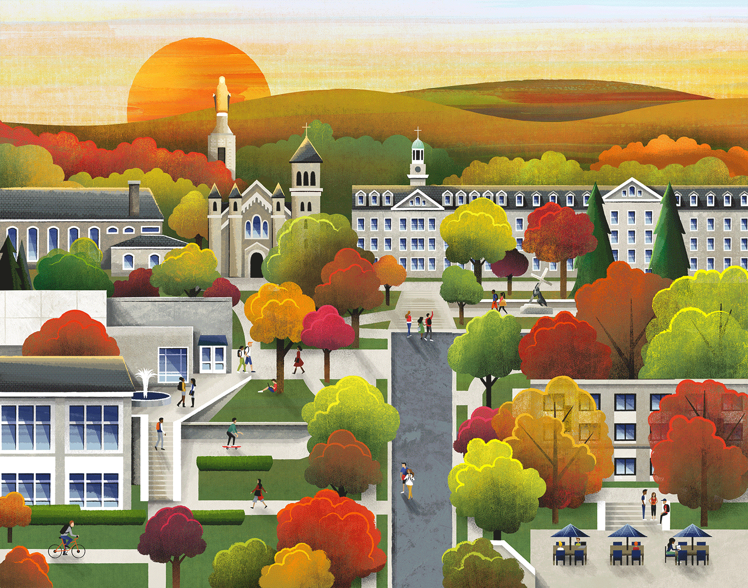 Mount St. Mary’s University seasonal campus illustrations, which have been used on university print pieces, campus signage and decor, and then translated into campus-themed Christmas cards.